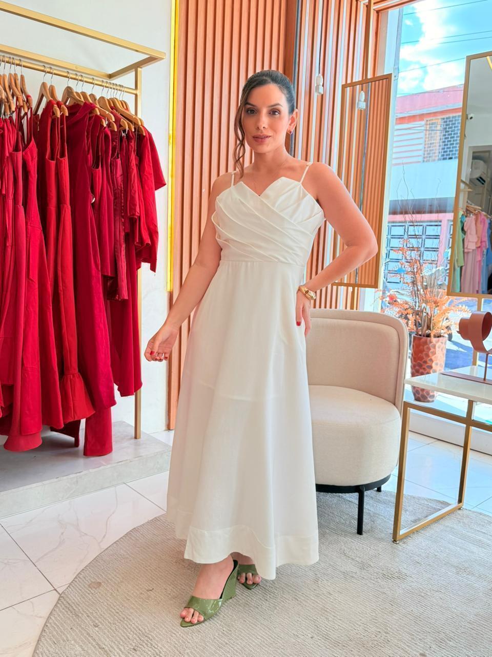 Este vestido longo é a escolha perfeita para quem busca elegância com um toque moderno e feminino. A peça apresenta um busto plissado com acabamento feito em camadas diagonais, criando um visual sofisticado e valorizando o colo de forma sutil. As alças finas trazem leveza e deixam a peça ainda mais delicada.